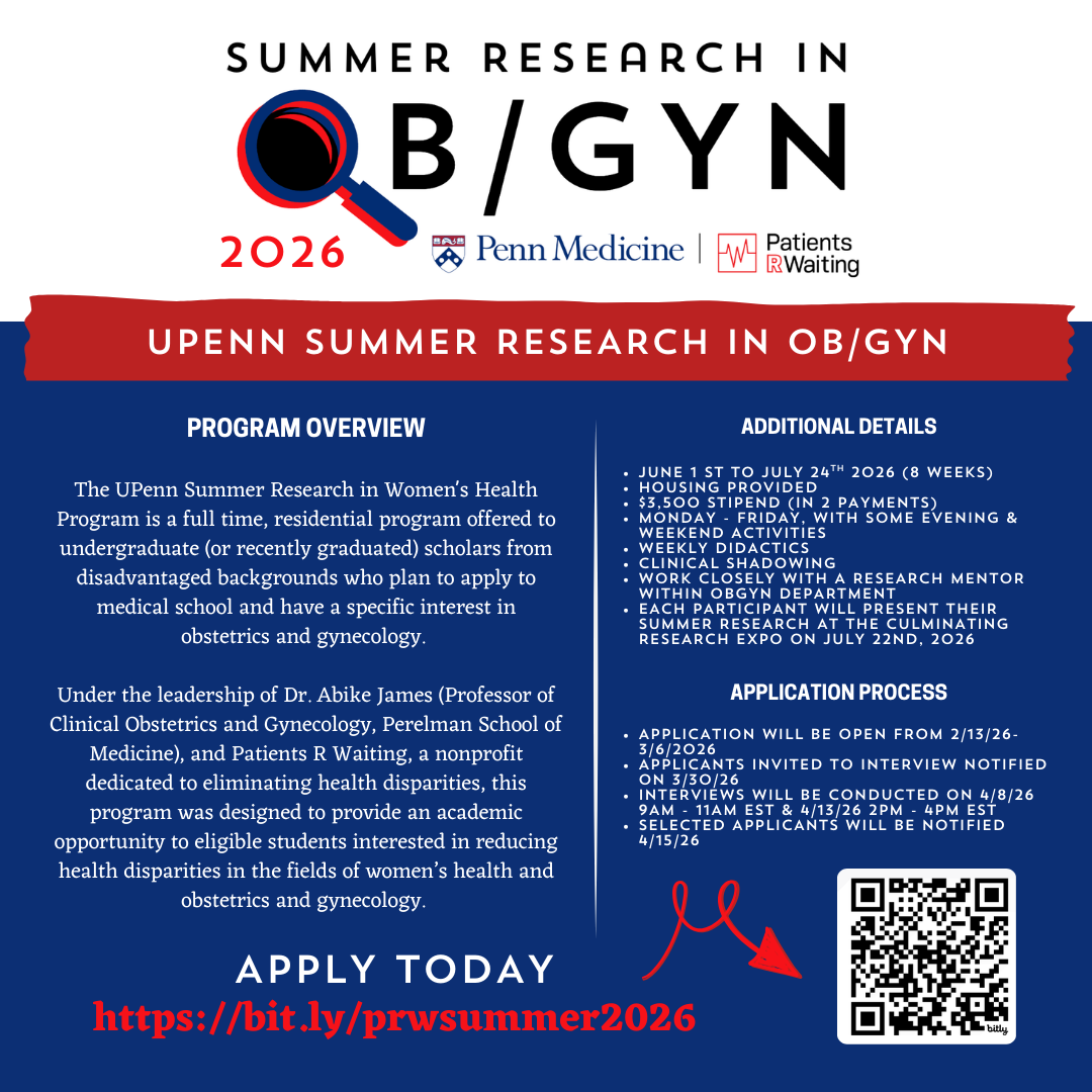 Under the leadership of Dr. Abike James (Professor of Clinical Obstetrics and Gynecology, Perelman School of Medicine), and Patients R Waiting, a nonprofit dedicated to eliminating health disparities, this program was designed to provide an academic opportunity to eligible students interested in reducing health disparities in the fields of women’s health and obstetrics and gynecology
